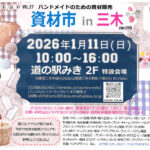 ■資材市 in 三木■ ハンドメイドのための資材販売・ワークショップ 手芸店では手に入らない資材、雑貨屋ならではの資材、1点もの、輸入商品、お買得商品など。 手作りされる方への資材・材料を多種多様取り揃えております。 お気に入りを見つけに、道の駅みきへお越しください。 【日時】2026/1/11(日) 10:00~16:00 【会場】道の駅みき 2階 特設会場 【主催・お問合せ】資材市実行委員会 mail:cafe2002country....