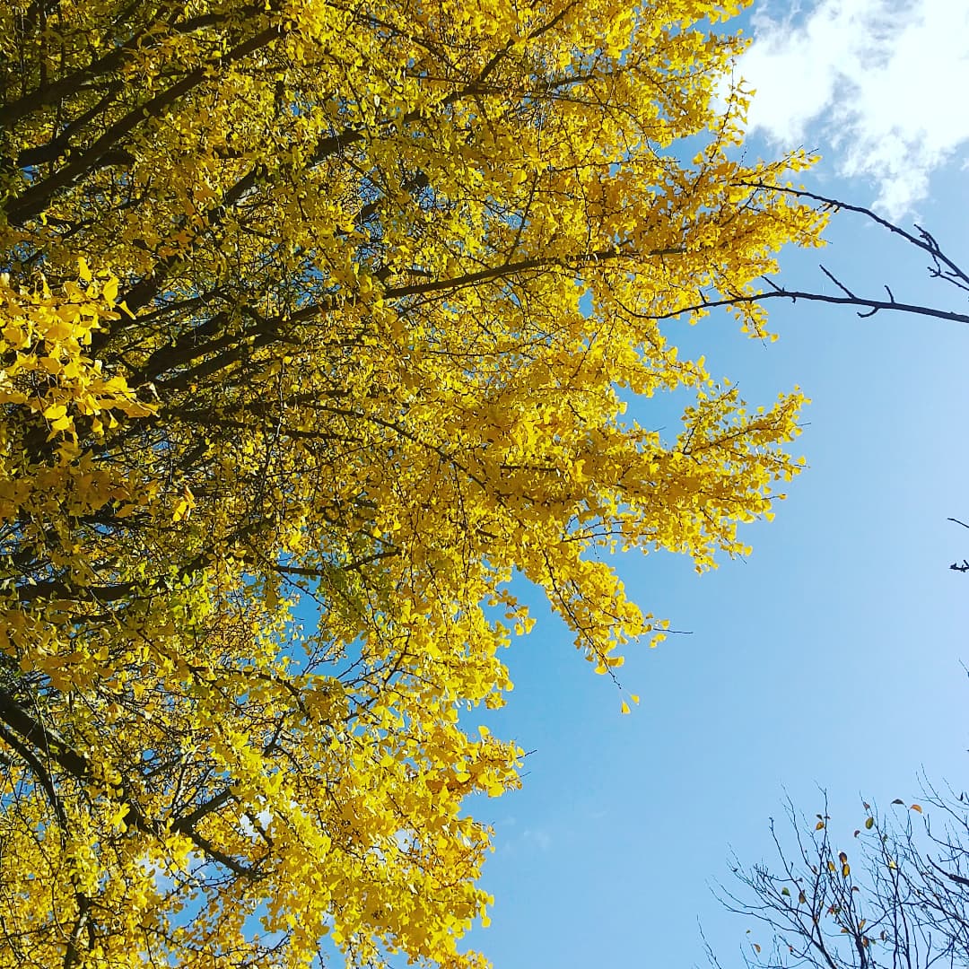 昨日、末広橋を渡っているときに、青空に向かって枝を伸ばす黄色に輝くイチョウが目に飛び込んできたので、たぶんこれが、のぶりんさんが言われていたイチョウだろうと、導かれるように行ってきました。
