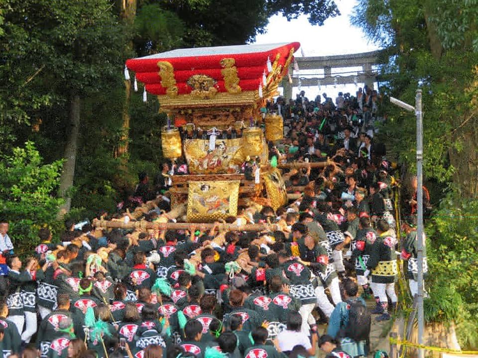 85段の石段を重さ約2トンもあろうかという屋台が担ぎ上げられ、宮入、宮出する様子は壮観です。