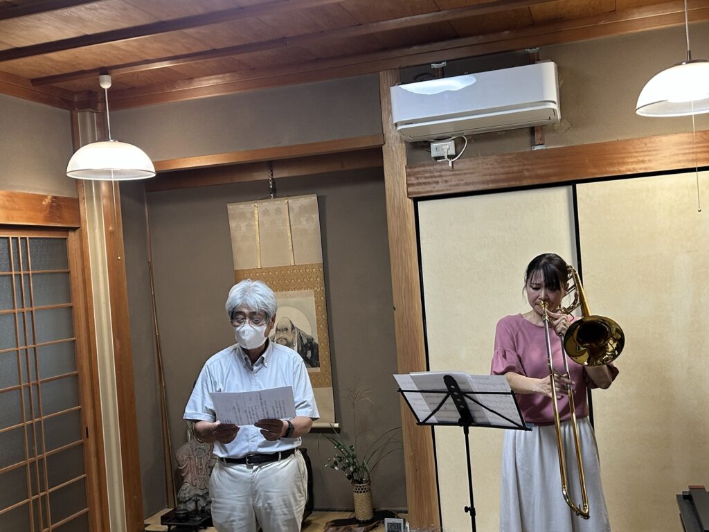 講演会では、トロンボーン奏者さんらしく、話の途中でトロンボーンを取り出し演奏してくれました。中ほどで、君といつまでも♪終盤に見上げてごらん夜の星を♪を吹いてくれてみんなで歌いました。