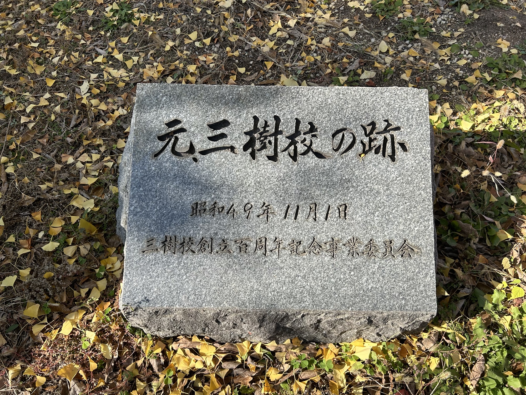 木の下には、ここに三樹小学校があったということを記すプレートが設置されています。