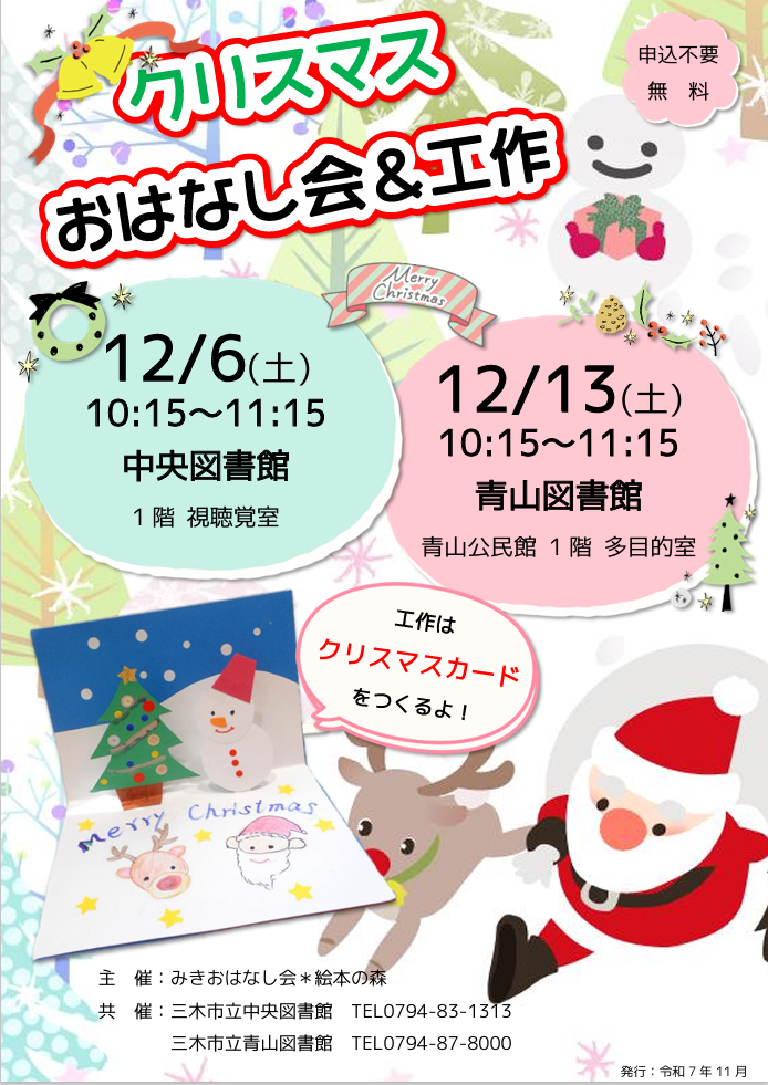 みきおはなし会*絵本の森によるクリスマスおはなし会&工作が中央図書館、青山図書館で行われます。