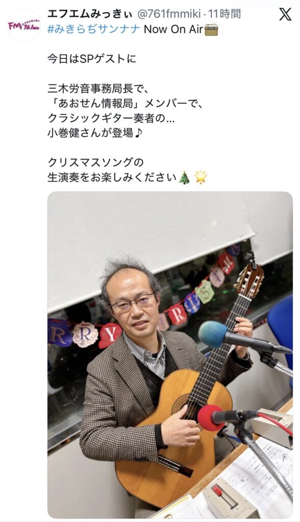 で、そのゲストとは、みきらぢハチヒル第一火曜のミュージックコーナーにも出演している三木労音事務局の小巻健さん。