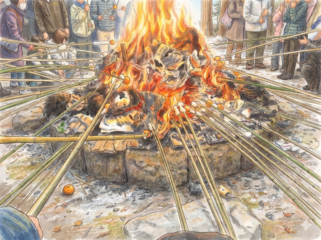 燃え残った火で餅やみかんを焼いて食べ、健康を祈願し、近年はコロナ禍で規模が縮小されつつも、多くの参拝者が訪れます。