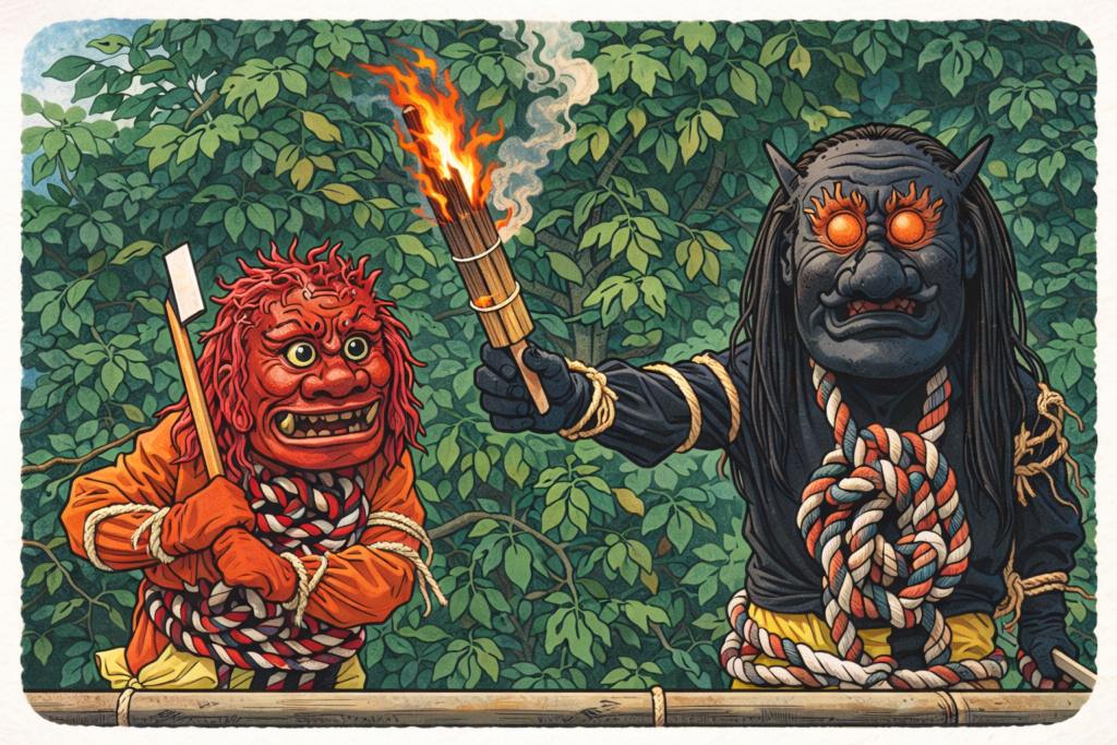 また、鬼といえば、節分の豆まきで鬼を追い払うように、悪の象徴とされていますが古い伝説に、その昔、善魂の赤鬼と黒鬼が、同族の無分別な非行振りを憂い、時の神と佛に心情を訴えました。神佛はその心情を汲み方策を与え、赤鬼と黒鬼は早速神佛の示した通りに松明を作り、大宮八幡宮の御燈明の火を松明に移してこれを振りかざし、荒れ回る鬼たちを鎮め、食豊かな春爛漫な平和が舞い戻った、とあります。