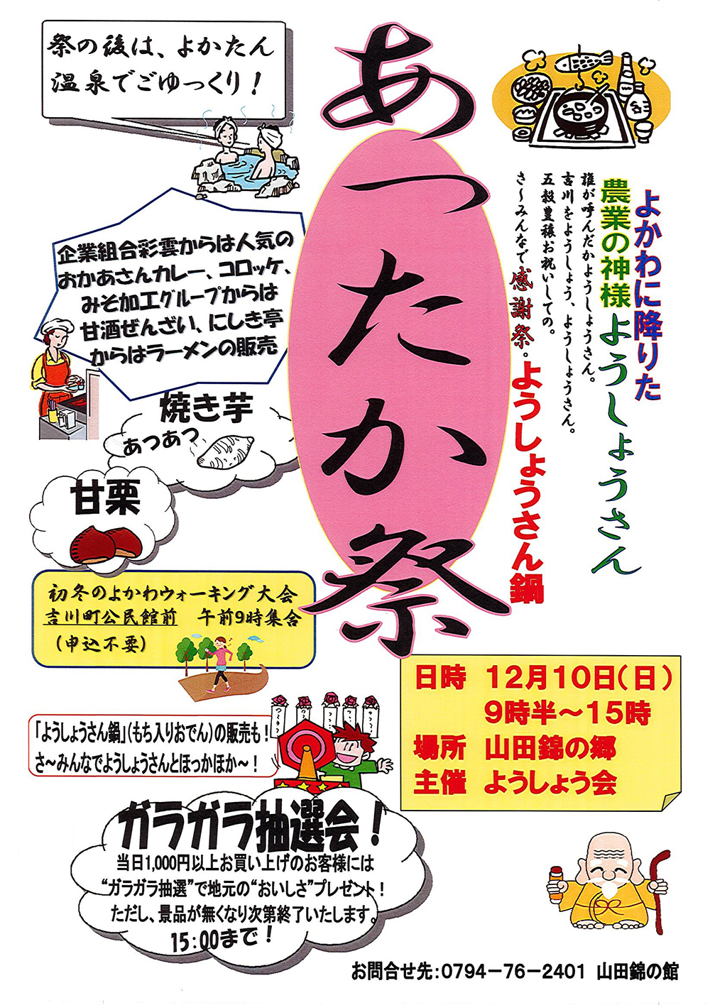 「ようしょうさん鍋」とは、楽しいことが大好きな「ようしょうさん」が、天から「あったか祭」の様子を見ていて、楽しくなって降りてきたのですが、その際、野菜で作られている自分に魂を注入し、その野菜で鍋を作れば風も引かず、元気な体で寒い冬を超すことが出来るということで生まれた鍋で、以来、「ようしょうさん鍋」としてこの時期にお目見えする名物料理です。